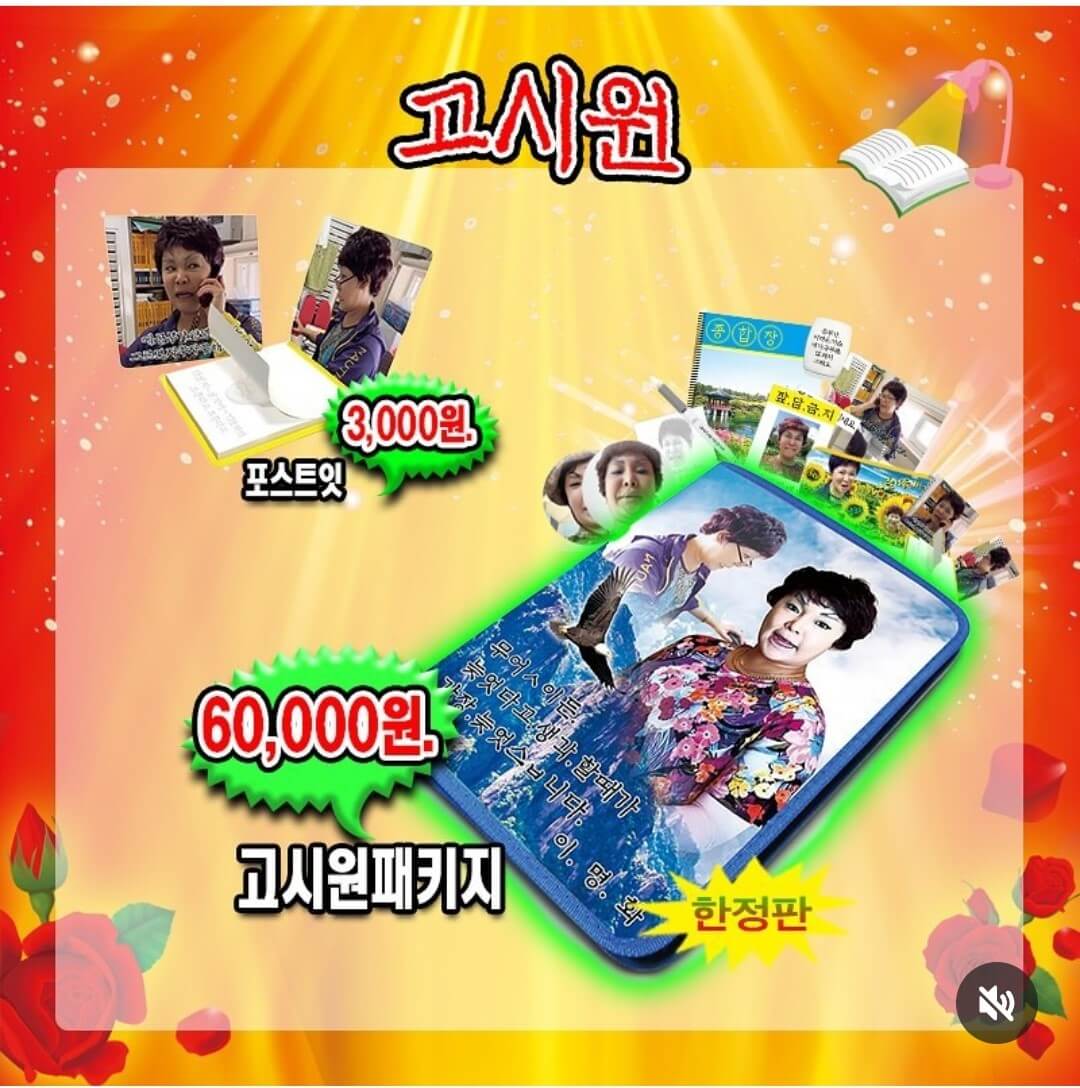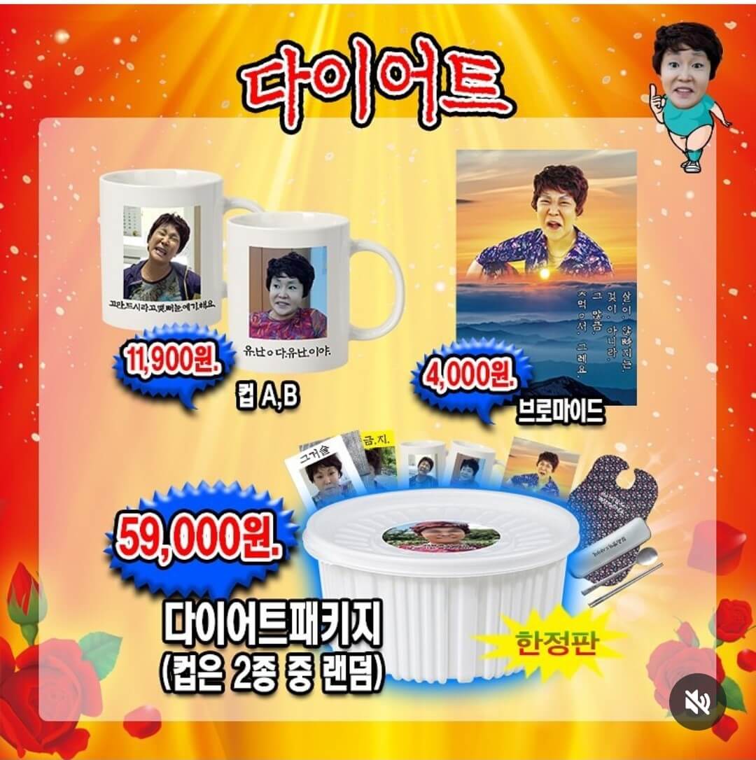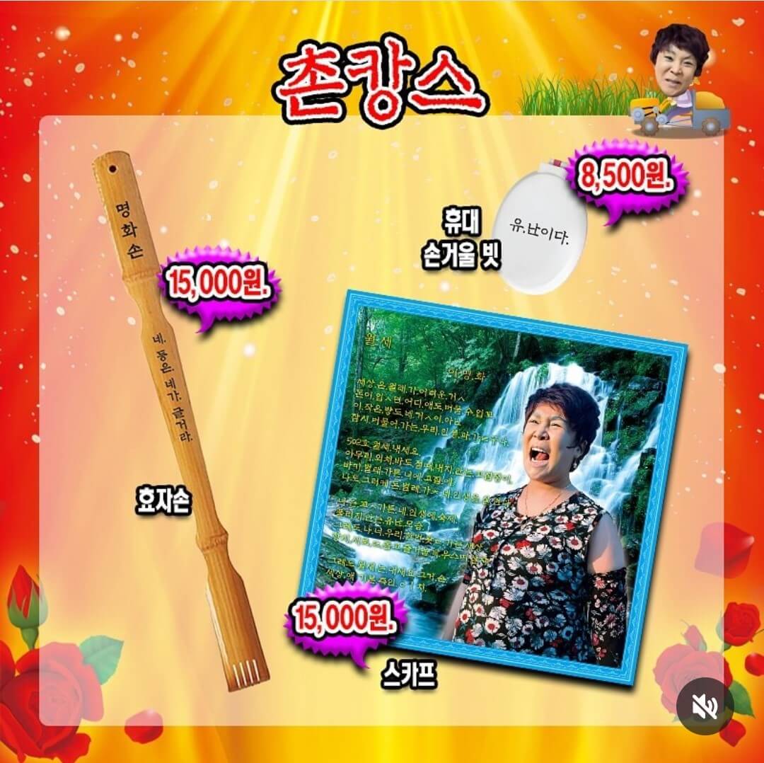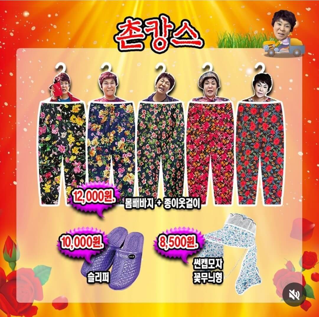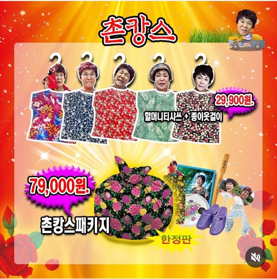 할머니티샤쓰+종이옷걸이, 꽃무늬 양은쟁반, 부채, 시장가방, 할머니조끼+아크릴 핀뱃지, 효자손, 휴대 손거울/빗, 스카프, 몸빼바지+종이옷걸이, 슬리퍼, 썬캡모자 꽃무늬형, 촌캉스 패키지