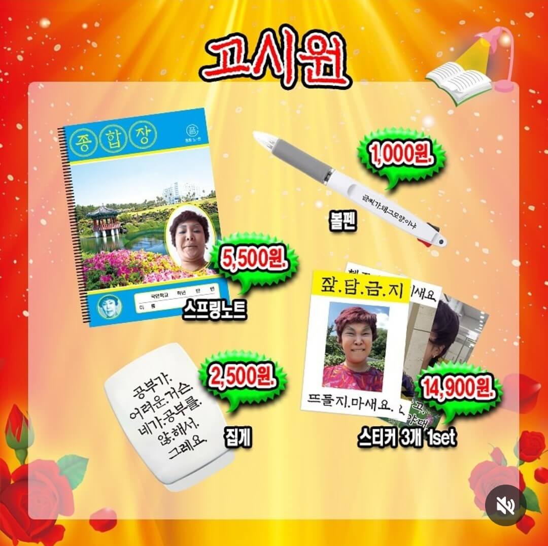 파우치, 떡메모지, 엽서, 스프링노트, 볼펜, 집게, 마우스패드, 지퍼화일, 스티커 3개, 포스트잇, 고시원 패키지