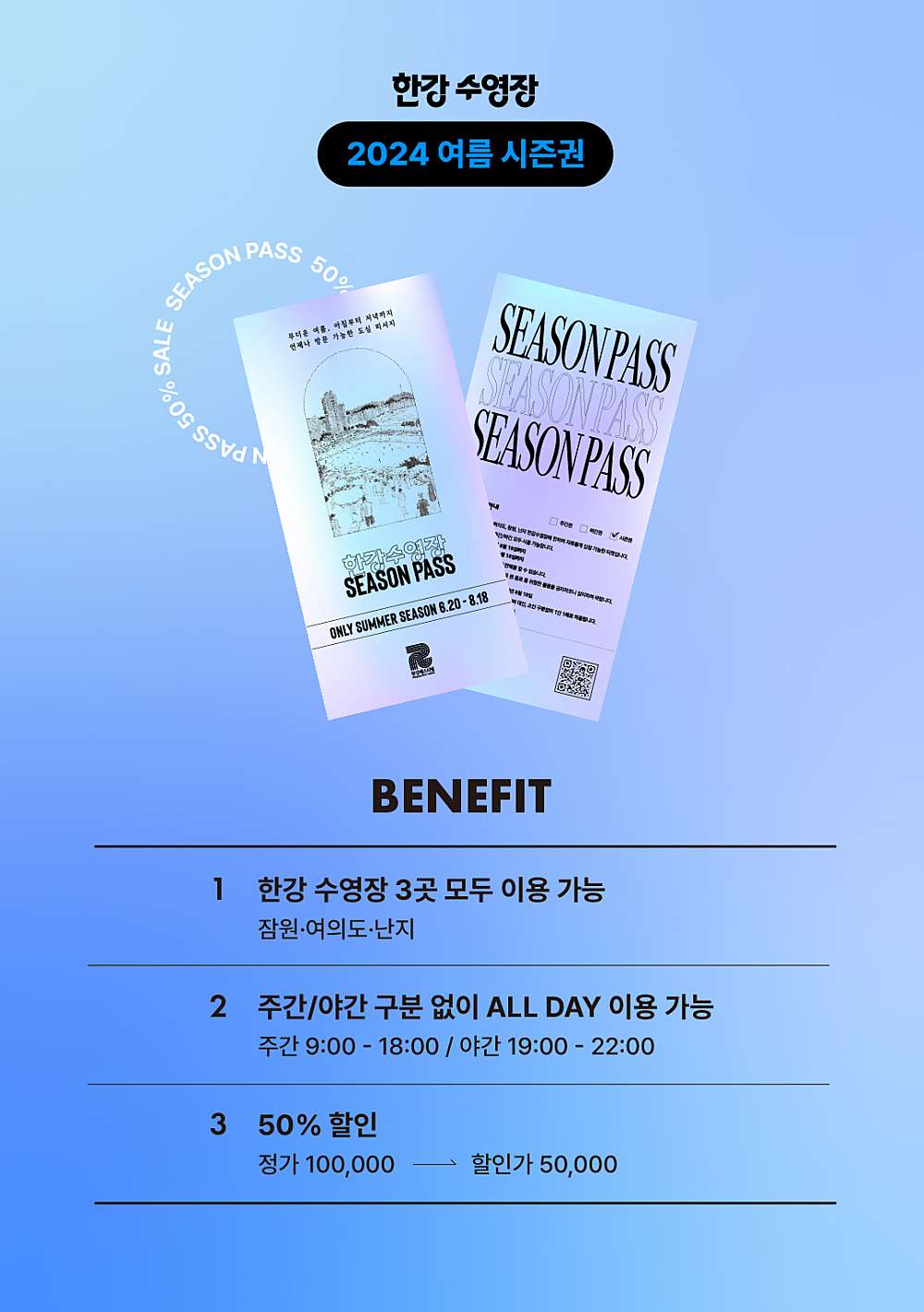 시즌권의 경우 주간/야간 관계없이 여의도/잠원/난지 3 개 수영장에서 기간 내 무제한으로 사용할 수 있는 이용권입니다.