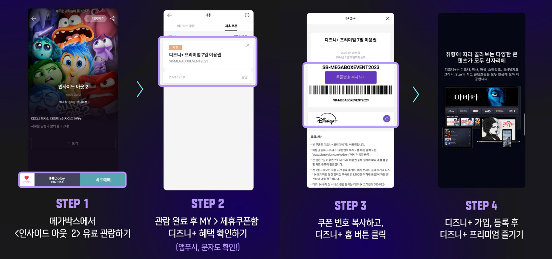 메가박스에서 인사이드 아웃 2 관람하면 디즈니+ 프리미엄 7일 이용권 혜택을 받을 수 있습니다.