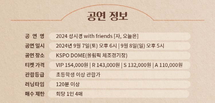 - 2024 성시경 with friends '자, 오늘은'의 티켓은 인터파크 티켓에서만 단독 판매되며, 그 외 경로로는 티켓을 판매하지 않습니다.