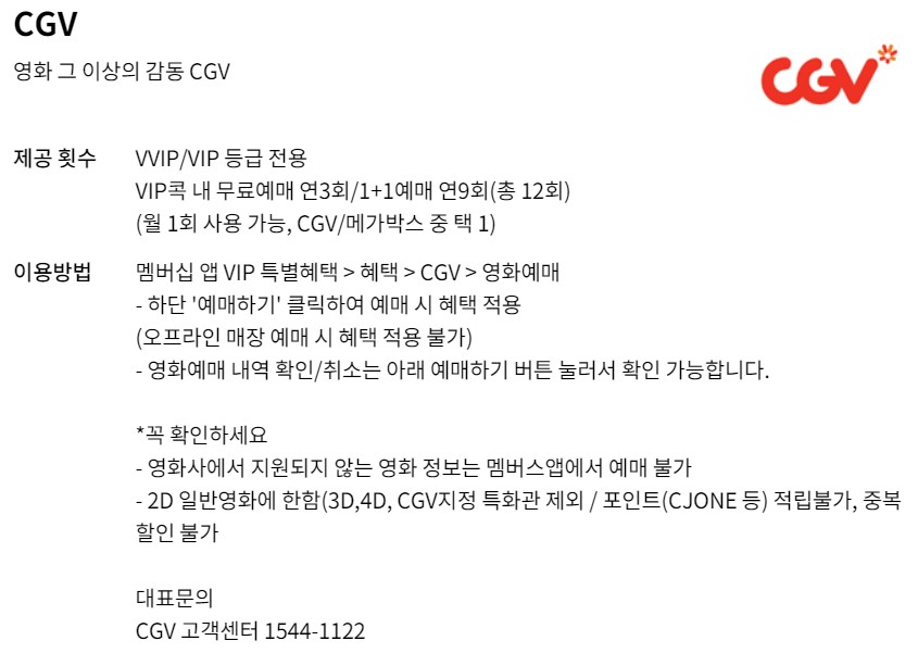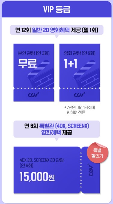 | 연 12회 일반 2D 영화혜택 제공 (월 1회) :본인 관람 (연 3회) 무료 :영화 관람 (연 9회) 1+1 *7,000원 이상 티켓에 한하여 적용 연 6회 특별관 (4DX, SCREENX) 영화혜택 제공 :4DX 2D, SCREENX 2D 관람 (연 6회) 15,000원 |