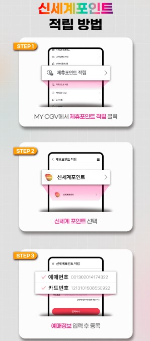 1. MY CGV에서 제휴포인트 적립 클릭 2. 신세계 포인트 선택 3. 예매정보 입력 후 등록 |