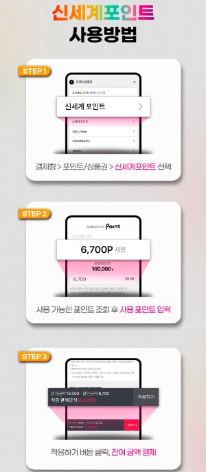 | 1. 결제창> 포인트/상품권> 신세계 포인트 선택 2. 사용 가능한 포인트 조회 후 사용 포인트 입력 3. 적용하기 버튼 클릭, 잔여 금액 결제 |