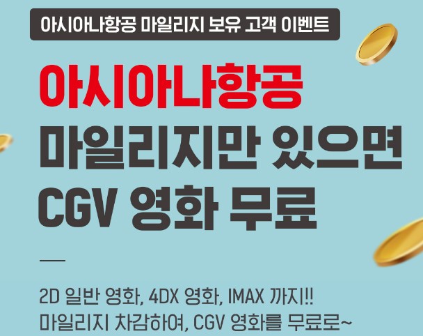 아시아나 항공 마일리지만 있으면 CGV 영화를 무료로 볼 수 있습니다.
